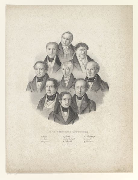 Curator: Welcome! Before us is a group portrait print dating from around 1839-1840 by Carel Christiaan Antony Last. It’s currently held in the Rijksmuseum collection. The print depicts Willem I Frederik, the King of the Netherlands, with his family. Editor: It’s quite a formal affair, isn't it? I'm struck by the repetition of round forms – the portraits are arranged in circles within a larger circle. There’s almost a factory-like approach to representing royalty here. Curator: Precisely. What appears initially as merely a decorative arrangement of royals conveys deeper cultural and political ambitions, it was, in many ways, propaganda to promote the image of a stable monarchy in a turbulent era. Consider the context; it was produced following the secession of Belgium. This print, created with reproductive technologies, offered broad public access to the royal image, underscoring dynastic continuity and solidifying loyalty. Editor: Right. We can see how printmaking was employed for mass production and distribution to reach a broader audience. It’s not about singular artistry but using a craft to reinforce authority. It reminds us of the work involved in the printing itself, from the engraving tools to the printing press—the material labour that helped maintain a king! Curator: Exactly! And note the stylistic elements. The artist adheres to academic art principles and realism in portraiture, enhancing believability and lending credibility to the depicted figures. Also, the composition is not accidental. By putting them into separate frames, it echoes a celestial structure. It's more than a family gathering; it's a constellation. Editor: A family constellation built with the labor of artisans, I would say! What do you make of the contrast of textures, though? Smooth skin against ornate clothing, soft light versus the rigidity of military garb. Curator: It emphasizes the deliberate construction of these people's roles and personae. Each costume is meant to signify stature, honour, and a connection to history and tradition. And each print, meticulously reproduced, extends that message exponentially. Editor: Indeed! It forces us to consider how accessible imagery influences beliefs in power and privilege. By thinking through its method, it reveals this artwork less as a celebration of dynasty and more a reflection of its mechanical reproduction as a system of power. Curator: This print demonstrates art's significant function as an ideological tool, and demonstrates the politics behind images we often consume innocently. Editor: I think viewing this artwork forces us to recognise the materiality inherent within what might seem just to be history, royalty, and lineage.