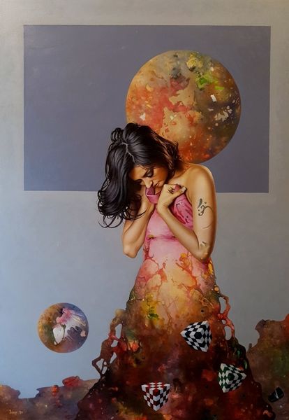 This is Dragan Ilić Di Vogo’s painting, Nista Vise, made with what looks like oils. The colours are mostly soft and desaturated, creating an atmosphere that’s both dreamy and unsettling. The way the paint is applied is really interesting to me. It's thick in some areas, like the swirling base of the figure, and almost transparent in others, particularly around her torso and face. You can see the brushstrokes and the texture of the canvas beneath, which gives it a raw, immediate feel, like you're witnessing the painting come into being. Focusing on the base, it's like a volcano of colours and shapes, reds and blues and browns mingling in a chaotic yet controlled way. I'm reminded of Hieronymus Bosch, not necessarily in subject matter, but in the density of details and the way the painting seems to contain its own world. Like all good art, it invites speculation and doesn't offer easy answers.