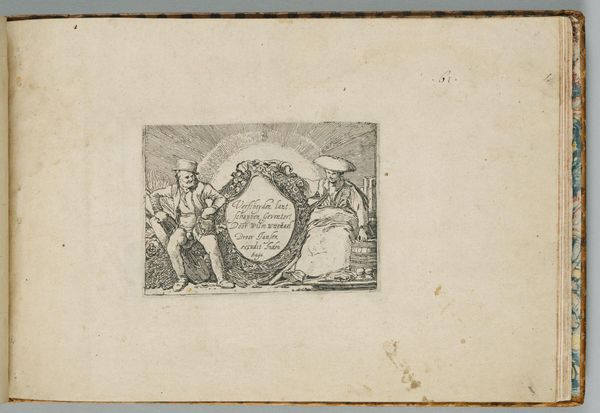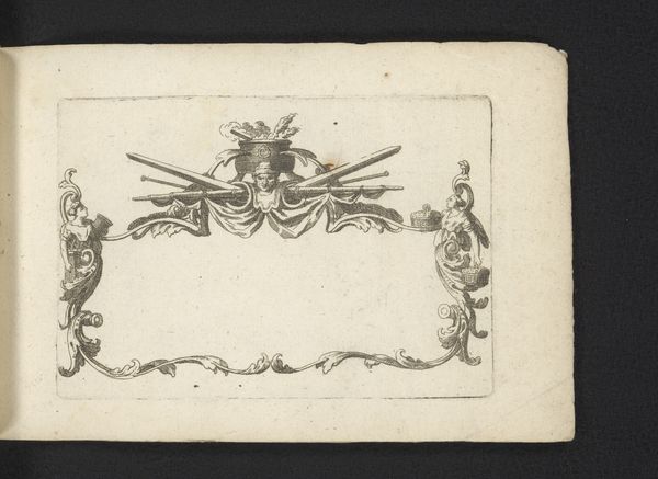Curator: Ah, another gem from the Rijksmuseum collection! This print, titled "Cartouche met proostende figuren"—"Cartouche with Toasting Figures"—is attributed to Nicolas Guérard and dates sometime between 1658 and 1719. Editor: You know, it strikes me as something utterly fantastical, almost like a fever dream sketched in ink. It’s light, frothy, a bit faded – whispers of celebrations from another era. What’s this decorative element actually meant for? Curator: Well, cartouches like this, particularly popular during the Baroque era, served as decorative frames, often around coats of arms, inscriptions, or… whatever one fancied! Here, Guérard uses figuration in a lively pen-and-ink sketch, somewhere between personal sketchbook and decorative art. Editor: Decorative escapism, maybe? Look at these characters, all draped robes and overflowing with wine. And those little cherubs! It's almost overwhelmingly ornate, yet playful with it. One could spend an hour tracing these winding vines. Curator: Baroque loved embellishment, and this piece certainly revels in it. Note the allegorical touches, too; I believe the toasting figures symbolize prosperity and good fortune, ideas that nobility would wish to associate themselves with! The engraving gives it a somewhat ephemeral quality, don’t you think? Suggesting even great celebrations will pass. Editor: Yes, but that's the wonderful thing about sketches, isn't it? They capture a fleeting feeling, a glimpse into the artist's imagination, even better than a grand history painting sometimes. Even this aged paper breathes that impermanence! I almost feel invited to draw in the empty cartouche, create my own party scene. Curator: That's the power of pieces like this—they’re accessible entry points to another time and mentality, and it also humanizes an age better known for royalty than humanity! Editor: A delightful snapshot into the festive spirit of centuries past! It is charming, almost fragile really. And, what’s more… perhaps this scene holds a bit of enduring advice: when life gives you grapes, make wine and toast to prosperity!
