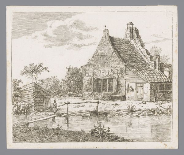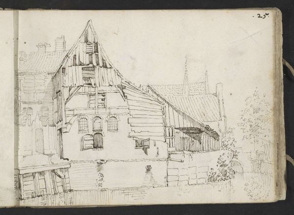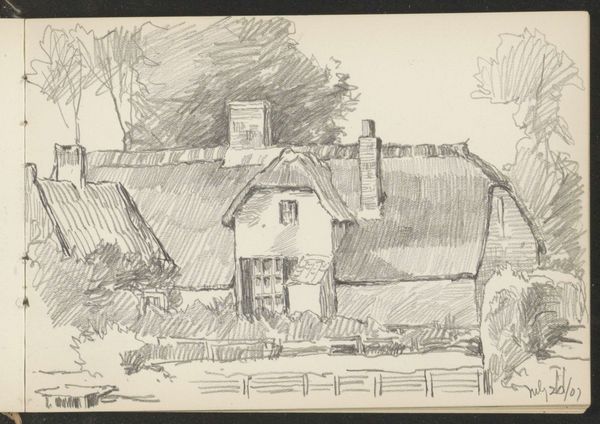 Curator: So, here we have Herman Antonius van Daalhoff's drawing, "Huis te Warmond," created sometime between 1877 and 1948. It appears to be a pen and pencil sketch on paper. Editor: Immediately, I get this wistful, almost melancholic feeling. It's a quiet scene, rendered in such delicate lines. It feels like peering into a memory. Curator: Indeed. Van Daalhoff was working within a time of considerable shifts in Dutch society and architectural styles. These detailed sketches offered a connection to older building practices. The picturesque qualities became more appreciated amidst urban developments. Editor: Right, it feels so personal. I love how he’s captured the textures – the thatched roof, the rough stonework. It's loose, yet conveys so much information. And there is something comforting about the familiar composition. Like a child's drawing. The Dutch Golden Age and the charm it offered... I wonder if he felt a pang of nostalgia documenting what could have seemed like the fading past. Curator: The choice to depict such vernacular architecture is quite significant. This was an era grappling with ideas of national identity and heritage preservation. Picturesque sketches like this contributed to romanticized views of the Dutch countryside. This piece of Realism becomes charged by the weight of history in preservation. Editor: I see the hint of that, but the image feels more immediate, more emotional. It feels to me like capturing the soul of a place. Almost as though I could hear birds. And it feels significant, it makes me think. What details of modern day places or spaces could I draw from memory alone to describe them in a succinct manner? What features would need to make the cut? Curator: It certainly has a quiet appeal. These images played an interesting role in defining public perceptions of Dutch heritage, feeding into a broader cultural discourse of national identity. Editor: I can definitely appreciate that layered significance, given your analysis. Still, I love the intimacy of the drawing. Makes you appreciate small moments and quiet, charming scenes. Curator: A lovely encapsulation of why it continues to resonate today. Thanks for that! Editor: Thanks for offering a crucial historical frame. I am grateful for the time, this was wonderful.