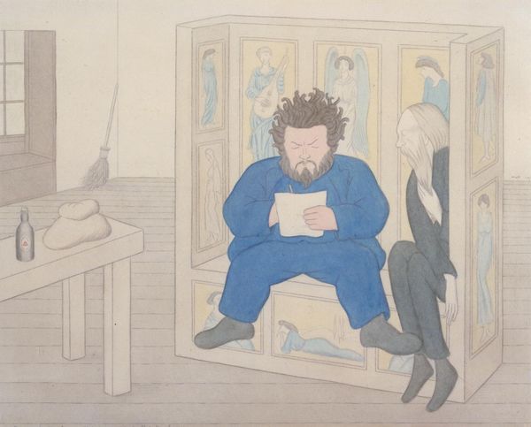 Curator: This is "Spring Cottage, Hampstead" by Sir Max Beerbohm. Editor: Oh, it's got such a wistful air. I can't tell if it's gentle melancholy or just awkward social dynamics, maybe a little of both. Curator: Well, Beerbohm was known for his caricatures. See how he's elongated those figures? It’s a theatrical exaggeration, harking back to 19th-century tropes. Editor: The colors are so restrained, almost faded. It adds to the sense that we're peering into a memory, or a stage set. Curator: Exactly! The tea service becomes a symbol of domestic ritual, weighted with unspoken narratives, the expectation or loss of a guest... Editor: It's quite captivating. Makes you wonder what stories these walls could tell. Curator: Indeed, a glimpse into a world both familiar and slightly dreamlike.