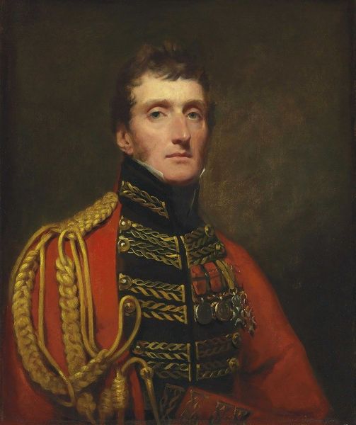 Curator: So, here we have what's known as the Portrait of Charles Fitzroy, 1st Baron Southampton. It's believed to be by Joshua Reynolds. Look at all that gold brocade! Editor: My first thought? Oh, that’s…stuffy. There’s something about the rigid posture and the over-the-top military attire that feels very restrictive, like he’s encased in social expectations and anxieties. Curator: Reynolds was known for his Grand Manner portraits; they were about elevating the sitter, connecting them to history. Think Roman emperors in modern dress! This Baron Southampton, it was about presenting power, position. Editor: Exactly, and there's the rub! It's fascinating how these displays of power rely so heavily on costuming, almost as if the power itself needs to be constructed and performed. What does the costume hide, I wonder? How does identity and rank interact in those layers? Curator: Maybe. I see a confident man ready to rule! The light catches his powdered wig and the red of his coat, emphasizing his robust, healthy color. It seems very deliberate. I imagine a good portrait was crucial for ascending social ladders back then! Editor: True, but I think it is crucial for reinforcing existing structures too. The stiff formality screams social hierarchy. Everything from his elevated gaze to the masterful rendering of wealth in those textures tells you he is above the average person. Curator: You bring up a good point: there's such intricate detailing here, Reynolds' ability to capture fabrics and textures using oils on canvas…truly remarkable. Almost photorealistic centuries before photography. Editor: And consider who had access to this "realism"! This image isn’t just a pretty face; it’s about perpetuating the idea of who gets to be immortalized, whose story matters, who has the resources to commission and control their image in history. Curator: Absolutely. Portraits were definitely markers of privilege. It is worth asking what stories might have been just outside that frame…But still, he does look ever so dashing in that wig and bright uniform! Editor: It is a stark visual reminder that what we see on the surface is meticulously curated. Power, wealth, constructed identities, and obscured narratives—all rendered beautifully in oil paint. That contradiction itself tells a compelling story.