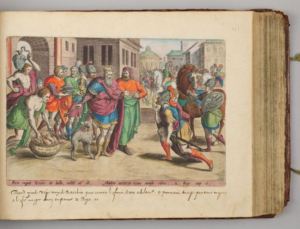 Curator: Here we have "Giving the Thirsty to Drink" by Adriaen Collaert. It's a 16th-century engraving, part of a series depicting acts of charity. Editor: It's striking, isn't it? All those figures crammed into a small space, practically begging for attention, like a visual shout. Curator: Absolutely! The composition is designed to overwhelm. Water, of course, is a major symbol here; life-sustaining, purifying… but also, the act of giving water connects directly to spiritual nourishment. Editor: I see that. It's so much more than mere thirst, isn't it? The crowded composition reflects the urgency and ubiquity of human need, so that the act of giving is a kind of divine intervention. What do you make of the dog sleeping on the floor? Curator: A great question! Could it represent indifference, or perhaps the humble recipient of unnoticed kindness? It adds another layer to the complexities of charity. Editor: This engraving leaves you thinking about who the needy are and who does the giving. The dog, the mother, the figures on the balcony—it all blends into a powerful commentary on human compassion. Curator: Yes, it is a small piece but invites us to reflect on the grand scale of humanity’s struggles and shared responsibilities.