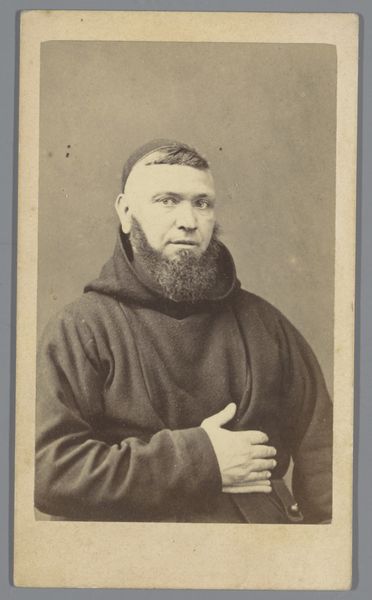 Albert Greiner, based in Amsterdam, made this photographic print. It's a portrait of a monk, likely produced through a chemical process involving light-sensitive materials, a camera, and darkroom techniques. Photography in the 19th century was a transformative technology, and it changed modes of production and social practices. The monk's attire, seemingly simple, speaks to the social context of religious orders. The folds and drape of the robe, the texture of the fabric, all these details become visible thanks to the photograph’s production process. The image allows for wider distribution, reaching audiences far beyond the monastery walls. This portrait democratizes access to religious imagery, creating something that invites questions about the intersection of faith, representation, and technology. It asks us to consider how photography itself reshaped the way we perceive individuals and their place within a community.