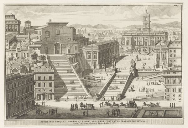 Editor: Here we have Jacobus Baptist's 1729 etching, "Colosseum and the Arch of Constantine in Rome," currently held at the Rijksmuseum. It's really striking how he contrasts the grandeur of these ancient ruins with what looks like everyday life in the foreground – gardens, people working. What stands out to you in this piece? Curator: Oh, it’s the layering of time, isn’t it? Baptist presents us with these colossal structures, relics of a vast empire, yet nestled right up against them are these mundane, human-scaled activities. It’s as if history is a stage set, and life just continues, unconcerned with the dramas that unfolded there. Does the etching style contribute to that effect for you? I wonder... Editor: Absolutely! The crisp lines and detailed etching really highlight the contrast – almost like different realities coexisting in the same space. How do you see that interplay between past and present affecting our reading of the artwork? Curator: For me, it's a gentle reminder of transience. Empires rise and fall, gladiators fight, emperors decree... and cabbages still need tending. There's a sly humor to it, too, don't you think? A wink from the artist suggesting the enduring power of the ordinary, even amidst the extraordinary ruins. It's a way of humanizing something we often view as monolithic and untouchable. Editor: That’s such a cool way to look at it! I hadn’t considered the humour before, but it totally makes sense. Curator: Perhaps we project our expectations onto these places; expecting grandiosity, drama. Baptist gently nudges us towards a more balanced perspective. It’s both humbling and oddly comforting, wouldn’t you agree? Editor: Definitely, and it's made me appreciate how art can make historical places feel relevant and alive. Thank you! Curator: My pleasure! It’s delightful when a piece sparks those kinds of connections, isn't it?