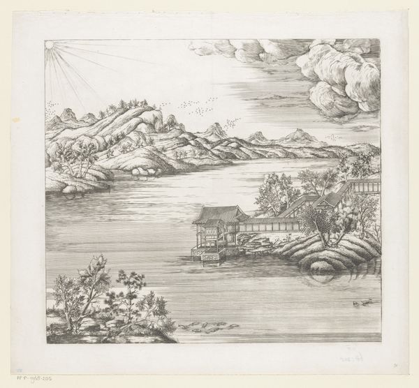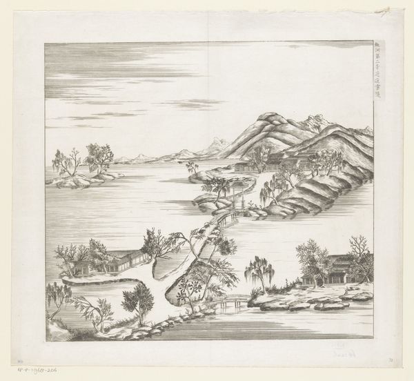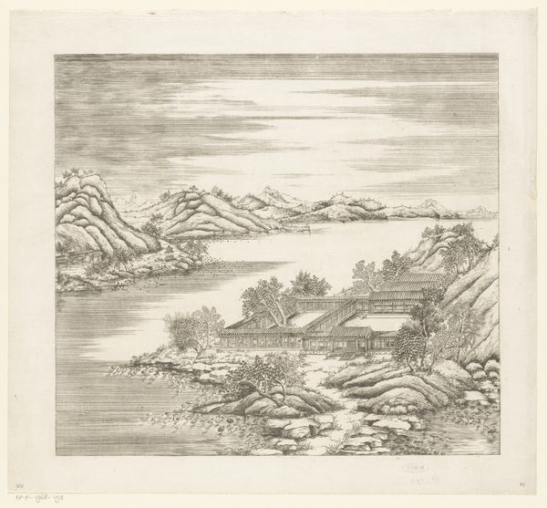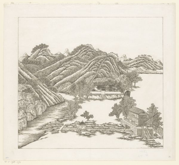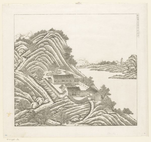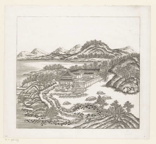 Matteo Ripa created this drawing of the Imperial Summer Palace in Chengde, China, using pen and ink. The detailed linear work, ranging from meticulously placed small dots to curved lines that evoke the natural landscape, leads your eye across the scene. The palace buildings are carefully constructed with multiple receding planes, drawing you into the depths of the image. The use of line and perspective transforms space, creating an expansive landscape on a relatively small scale. The dotting technique, especially noticeable on the water, suggests a surface texture while also flattening the space, challenging traditional notions of depth. This play with perspective disrupts a singular viewpoint. Ripa's drawing is a formal exercise in contrasts: nature versus architecture, depth versus flatness, and Eastern subject matter rendered with Western techniques. It invites you to consider how the formal structure embodies a convergence of cultures, challenging fixed notions of representation.