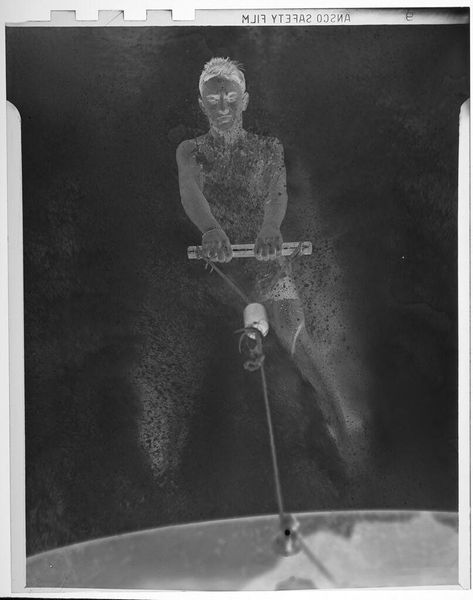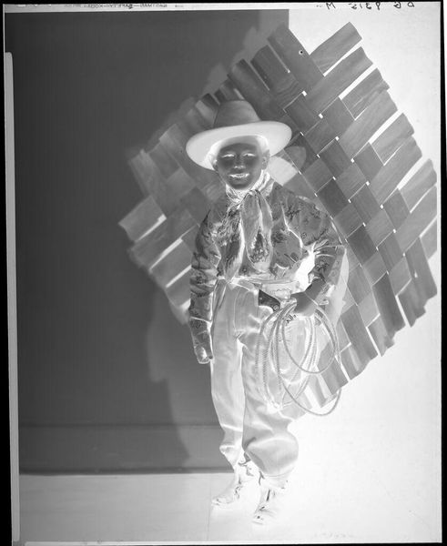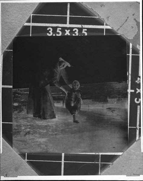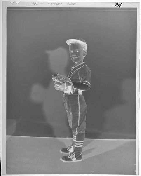 Curator: This photograph, of uncertain date, by Lucian and Mary Brown, is titled "Untitled (girl on bicycle)" and presents an ethereal image of childhood. Editor: It's a striking inversion of light and shadow, really, casting a strange dreamlike pall over an everyday scene. Curator: The bicycle itself, with its elegant lines and bulbous headlight, functions as a symbol of freedom, of burgeoning independence. Editor: And the girl's downward gaze? A contemplation of the path ahead, or perhaps a deeper introspection, typical of adolescence? Curator: I see it more as a compositional device. The angle of her head leads the eye down to the bicycle, grounding the figure within the frame. Editor: Still, there's a nostalgic resonance; the bicycle evokes vintage posters, the girl could be any child poised on the brink of momentous change. Curator: Perhaps, but I'm more drawn to the formal aspects—the play of positive and negative space, the almost ghostly quality of the print itself. Editor: It's an image ripe with possibility; a simple ride transformed into something far more profound. Curator: Indeed, it's a compelling work, regardless of the intended symbolism.