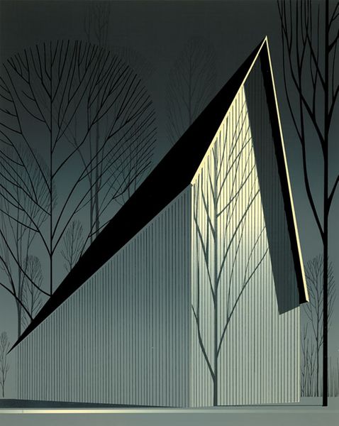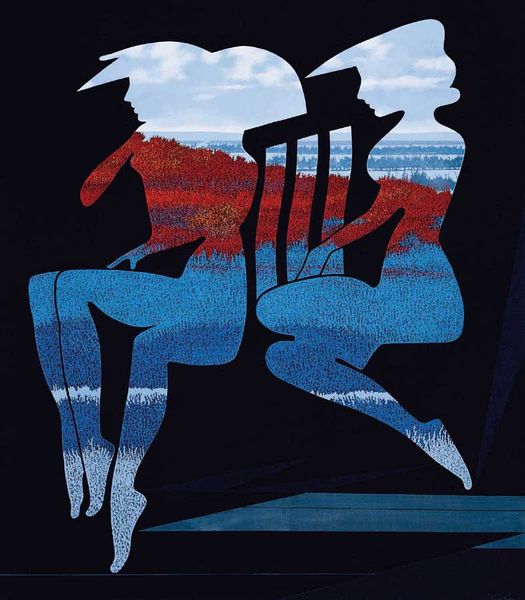Editor: Here we have Eyvind Earle's "Turquoise" from 1983, done in tempera. It feels very stylized, almost like a flattened stage set. The trees are so graphic, and the whole thing is built from distinct shapes. What draws your eye when you look at it? Curator: What strikes me is Earle’s conscious manipulation of the material. He chooses tempera, known for its opacity and quick-drying qualities, enabling him to create these distinct, almost graphic, layers. It allows for minimal blending, emphasizing the constructed nature of the landscape. Look at the buildings; do they seem prefabricated to you, almost commenting on post-war suburban sprawl through a material lens? Editor: I see what you mean! The shapes of the buildings *are* really basic, and the crisp lines add to that manufactured feel. So you're saying the materials aren't just about the visual style, but also speak to the subject matter? Curator: Precisely. Consider the smooth, flat application of paint, eliminating any sense of texture. Is he, perhaps, pointing to the disconnect between idealized notions of nature and the manufactured reality of our built environment? Think about the labour involved in creating such a smooth surface, in direct contrast to the textured roughness we might expect from 'nature'. Does that shift your reading? Editor: It does, especially thinking about that smooth surface as deliberate labour! I hadn’t considered the buildings reflecting a critique about suburban life, but the conscious choice of materials really does give that idea weight. Curator: Material choices are never neutral! And thinking about the context, tempera has associations with both early Renaissance altarpieces *and* commercial illustration. What tensions do you think that adds to the piece? Editor: So, high art versus mass production! Seeing it that way definitely deepens my understanding. Thanks! Curator: Likewise! Paying attention to the materiality always adds new readings to our understanding of a work, expanding both context and narrative.