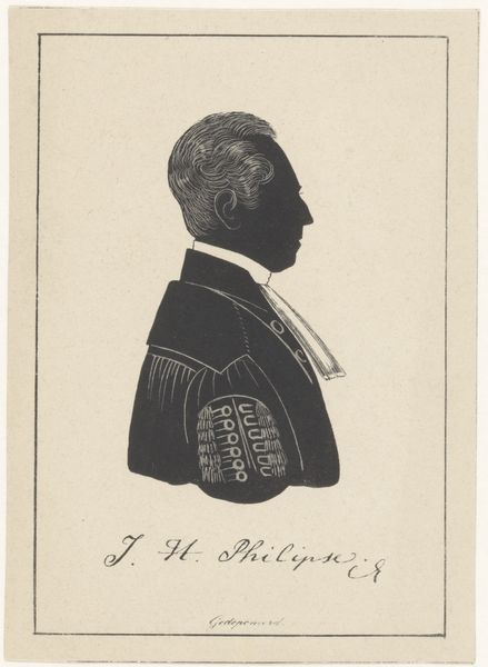 Editor: This is "Silhouetportret van Philipp Christiaan Molhuysen" by Pieter Barbiers (IV), dating from somewhere between 1809 and 1848. It’s an ink drawing and is very striking – so stark and formal. What do you see in this portrait? Curator: I see a study in contrasts, literally! The black ink against the pale paper creates a graphic punch, wouldn't you say? And though it’s a silhouette, it feels surprisingly detailed. The way the artist captured the gentleman's hair, for instance, it has a real lightness. This kind of profile portrait was popular, a quick and relatively inexpensive way to capture a likeness. Do you get a sense of the sitter's character from this flattened form? Editor: I suppose I do. There’s a certain…stiffness. I can’t imagine him laughing, can you? But how much can we really infer from what is essentially a shadow? Curator: Exactly! Isn’t that the question that portraiture always poses? It invites us to speculate. What did this Mr. Molhuysen do? What were his dreams? And does this silhouette bring us any closer to him, or is it just another mask? Editor: A mask of ink, perfectly preserved. It's strange to think of him only as this outline, existing perpetually in profile. Curator: Indeed. Art offers us little mysteries like that, whispers from the past prompting us to dream up our own stories. Each viewer paints their own version of Molhuysen, it would seem.