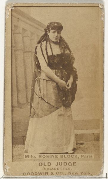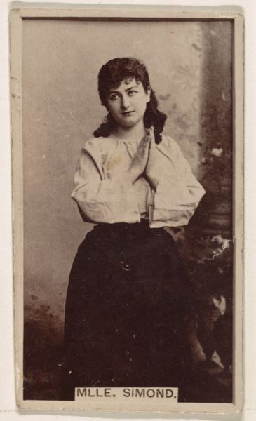 This small card featuring Mlle. Simond was produced by W. Duke, Sons & Co. around the turn of the 20th century as part of a series of promotional items included with Duke Cigarettes. These cards, which featured actors and actresses, reveal much about the cultural values of the time, particularly regarding gender and performance. Mlle. Simond, like other actresses featured in these series, was a public figure whose identity was both celebrated and commodified. Her image, carefully constructed for the stage, was reproduced and distributed, turning her into a collectible object. The popularity of these cards speaks to the growing celebrity culture and the way images of women were used to sell products, reflecting a complex interplay of admiration, consumerism, and the evolving role of women in public life. The deliberate staging of her image offers insight into the representation of women at this time, navigating the fine line between private identity and public persona.