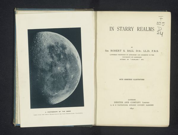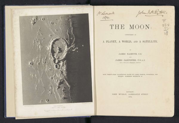 Here is a photograph of the first quarter moon by Lewis M. Rutherfurd, published in London in 1873. The book, titled 'The Moon: Her Motions, Aspect, Scenery, and Physical Condition', places Rutherfurd's lunar photographs alongside the writings of Richard A. Proctor. At a time when photography was still a relatively new technology, images of the moon provided a unique perspective on the cosmos. These were moments of scientific advancement but also moments of aesthetic appreciation, reflecting a deep cultural fascination with astronomy. Rutherfurd’s photograph captures the moon in great detail, presenting it not just as a celestial body but as a landscape worthy of exploration. I am always struck by the collaboration between science and art that this book embodies, inviting us to consider the emotional and imaginative dimensions of scientific discovery.