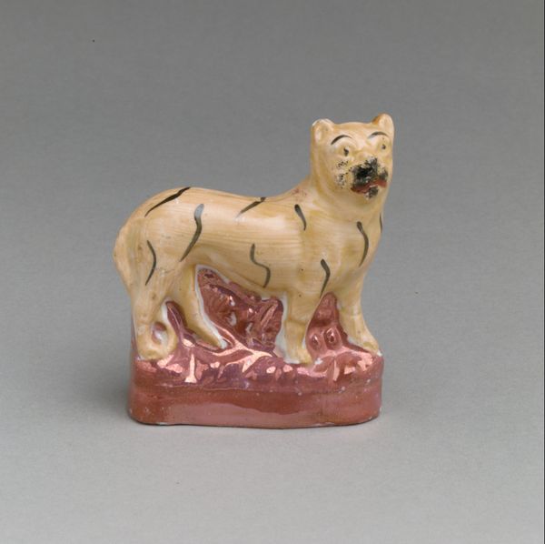 Editor: This is "Figure of a Seated Lion," a porcelain sculpture created by Wilhelm Caspar Wegely around 1752-1757. I find the lion's expression so peculiar, almost docile, and its paw is raised as if in greeting. What can you tell me about this piece? Curator: Well, lions throughout history, particularly during the Rococo period, often represented power, royalty, and control. But the somewhat gentle expression you observed might suggest a tension or commentary on these very ideals. In a society steeped in hierarchy, how might Wegely, through his artistic choices, be subtly critiquing or softening those established power dynamics? Editor: So you are saying this gentler portrayal could challenge traditional assumptions about power and authority? Curator: Exactly. It’s interesting to consider how Wegely employs a delicate material like porcelain, which is typically associated with fragility and domesticity, to depict such a powerful creature. Does the lion's smaller size contribute to subverting its authority as well? Editor: It does. Knowing this was created during the Rococo era, which was dominated by elaborate decoration, do you think the relative simplicity of the sculpture relates to social themes as well? Curator: Yes, the Rococo style celebrated luxury and excess, but there were also intellectual undercurrents questioning such extravagance. Could this sculpture, with its simplified form and seemingly gentle demeanor, be a commentary on the values of that time? Perhaps Wegely's lion offers an alternative perspective. Editor: I see. Considering the time, the decision to show a tamed lion speaks volumes! I'll never look at Rococo art the same way. Curator: Precisely! It reminds us that art is always in conversation with the social and political landscape. It invites us to continuously question dominant narratives.