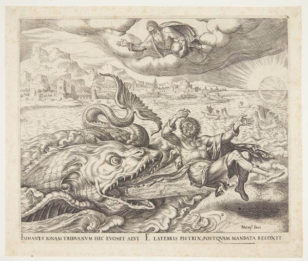 Curator: This print, "The Big Fish Eat the Little Fish," was created in 1619 as a satirical commentary on the downfall of Johan van Oldenbarnevelt. The artwork is unsigned and is an engraving. Its current home is here at the Rijksmuseum. Editor: Wow, it's like a bizarre aquatic food chain gone completely wild! I'm immediately drawn to that enormous, monstrous fish in the center devouring everything in sight. Gives me a kind of dark, absurdist fairy-tale vibe. Curator: It’s Baroque in its excess, isn't it? Consider how this print functions as political propaganda, reflecting the turbulent period in Dutch history, steeped in power struggles. The imagery is incredibly pointed – with "Barneveldtische Monster" scrawled onto the giant fish itself. We should contextualize its meaning for our contemporary audience. How do systems of power still function this way today? Who are the little fish getting eaten right now? Editor: Exactly! Art with teeth. I can't help but wonder what that artist, whose name is lost to history, was truly feeling. Pure rage, maybe? Or some kind of cynical amusement, given all the tiny details sprinkled around like little, inky jokes? The poor small fish are being gobbled up, even those hauled up in a fisherman's net in a small boat down below! The monstrous fish, the monster that is labelled Barneveldt himself, casts an overwhelming shadow. The fish’s monstrous, mechanical hand looks ready to swallow everyone. Curator: It's potent visual rhetoric, crafted to shape public perception of Oldenbarnevelt. The artist uses scale, allegory, and visual cues to amplify the critique. How would feminist theory understand this depiction? What of post-colonial theory, considering the global stage and how systems perpetuate injustices? What narrative is not present? We must offer multiple perspectives, not simply assume that it encapsulates any objective truth. Editor: Absolutely. These old images spark questions as well. Thinking about power structures and being swallowed whole like one of these little fish makes you realize… things might look different now, but the undercurrent is eerily the same. Curator: It does encourage us to reconsider, in whose interests do dominant discourses continue, who is granted the agency to tell these narratives, and who profits most from their reach? Editor: A seriously relevant antique, wouldn't you agree? Definitely makes me think twice before jumping into the pond, haha!