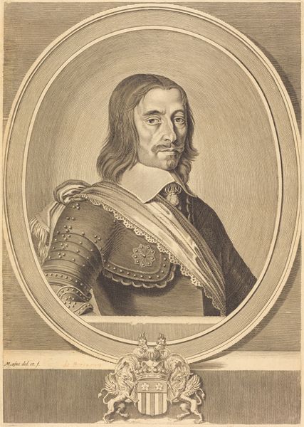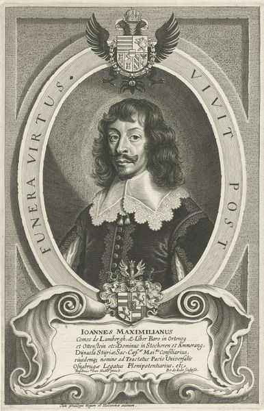 Curator: Standing before us is a print dating from sometime between 1648 and 1697, "Portret van Claudius de Mesmes, graaf d'Avaux" rendered by Paulus Pontius. An engraving, this piece currently resides in the Rijksmuseum. Editor: There's a melancholic air to it, wouldn’t you agree? The stark contrasts create an almost somber mood. His gaze, the dark tones… it speaks of a reflective, perhaps burdened individual. Curator: The artist certainly emphasizes line and texture to an intriguing degree. Notice the ornate details of the oval frame, filled with text, versus the relatively more simplified depiction of Claudius himself. It's a formal arrangement. Editor: And what a potent symbol of power—look at the family crests emblazoned above and below him, and then the Latin inscriptions wrapping the image, which seem to invoke some divine support of his labor. The sash indicates his high office, reinforcing his importance. One can sense his striving. Curator: Precisely. Observe how the baroque ornamentation functions less as pure decoration, and more as a structuring device. It emphasizes a rigid symmetry that is disrupted just slightly by the dynamism of his hair. There is an inner tension at play in how Pontius has organized these disparate elements. Editor: Beyond formal devices, consider the cultural weight: a diplomat in a time of significant European upheaval—the Thirty Years War ended just around the time this print was created. That context surely influences the meaning we draw from this portrait; his very image broadcasts power, authority, but perhaps even a sense of resignation in the face of such immense political pressure. Curator: A fascinating suggestion. Indeed, considering the engraving as both formal construct and historical document does add layers of interpretative depth to our experience. Thank you. Editor: It’s these visual records that remind us that history isn't just names and dates, but a tapestry woven from symbolic acts of self-presentation like this. Fascinating, isn't it?