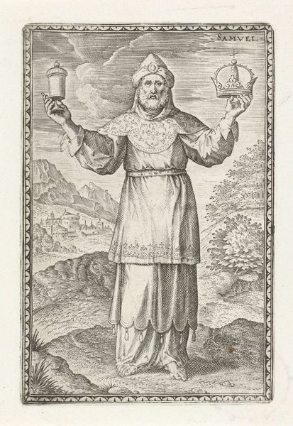 Curator: Glimpsing this piece for the first time, the overwhelming darkness contrasting starkly with the saint’s luminous face produces an immediate sensation of dramatic tension. Editor: That's fitting, given this engraving by Gérard Edelinck, after a design by C. Galle, depicts "Petrus Martyr." It likely dates between 1652 and 1666. The line technique truly adds to that chiaroscuro effect you mentioned. Curator: The linear hatching, combined with the subject matter, signals the Baroque style, imbuing the saint’s figure with an otherworldly intensity. Editor: And look closer at the weaponry—a piercing arrow and an upright sword looming above his head, they are symbols that speak volumes about martyrdom and the political and religious climate of the era. This was a time of considerable turbulence and religious strife. How do these violent motifs position Petrus Martyr within that conflict? Curator: It serves as a grim reminder of religious persecution. Petrus, holding the martyr's palm, his gaze seemingly fixed upwards as if towards salvation or judgement. The landscape glimpsed in the upper-left also acts to establish his former position as a Dominican preacher traversing dangerous spaces. Editor: Observe how Edelinck utilized his mastery of line to carve texture from his simple strokes; from the velvety shadows of the robes to the smooth expanse of Petrus' face, they masterfully communicate a dynamic play of light and shadow. And don't overlook the careful balance; the palm and arrow counter the positioning of the sword—which speaks to the Baroque aesthetics of harmony achieved through visual contrast. Curator: It's hard to separate that aesthetic approach from the narratives being portrayed and perpetuated, though. The rendering of Petrus emphasizes his sanctity. The deliberate staging of his suffering speaks to historical struggles within larger religious and cultural conflicts—shaping our understanding of sacrifice and belief in relation to gender, power and politics. Editor: Very true. That the artist has situated us within history. Curator: Indeed. It is interesting to note how the piece is still able to invite nuanced reflections. Editor: A fitting note, I think, on which to end.