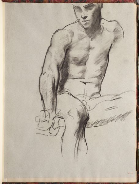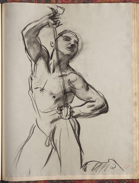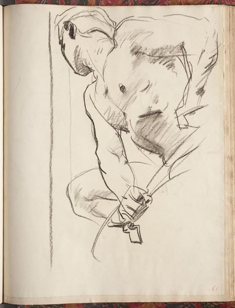 Editor: This is John Singer Sargent's "Study for Seated Angel at Left, 'Israel and the Law,' Boston Public Library," a charcoal drawing. The figure's sketched musculature is striking. What do you make of the composition? Curator: Observe how the artist uses line weight to define form, specifically the contrast between the sharply defined upper body and the more gestural treatment of the lower half. The structural tension invites inquiry. Editor: So the incompleteness is intentional, a way to draw us in? Curator: Precisely. Consider the interplay of positive and negative space, and the deliberate ambiguity, and how it enhances the dynamism of the figure. Editor: That's fascinating; I hadn't considered how the unfinished quality contributes to its power. Curator: Yes, artistic expression often uses such contrasts to focus our perceptions.