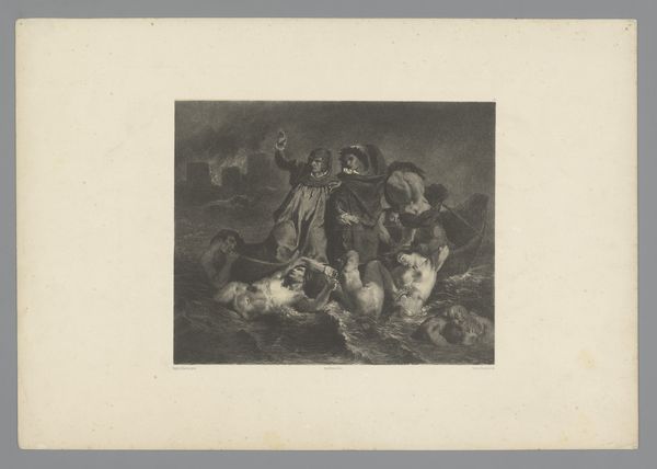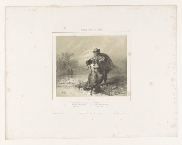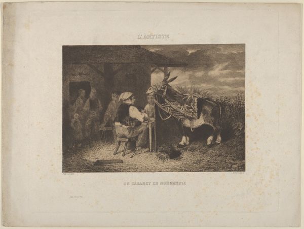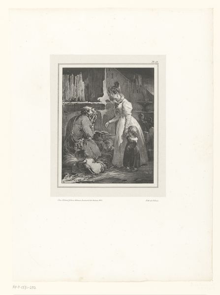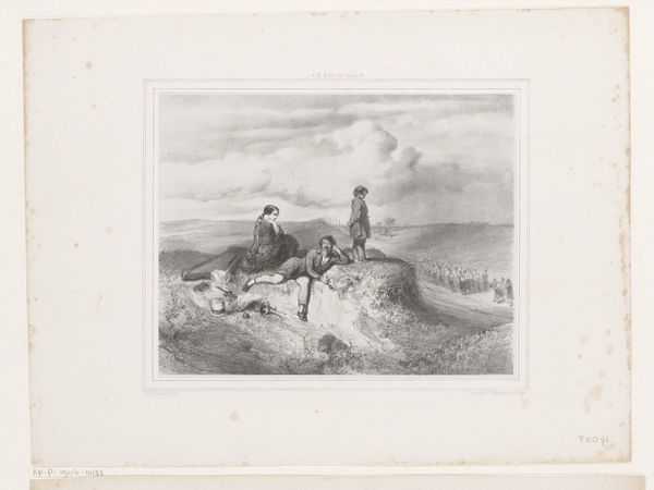 Curator: Here we have “Familie onderweg,” or "Family on the Road," an engraving from sometime between 1816 and 1882, created by Edouard Schuler. Editor: It’s stark. The overcast sky, the weary posture of the family... there’s a real sense of hardship conveyed here. It’s almost theatrical, wouldn't you say, given the stark foreground versus dramatic clouds? Curator: Absolutely. The romanticism is evident not only in the sweeping landscape but also, I believe, in the conscious depiction of labor and migration. We're seeing a glimpse of how lives were materially shaped, day by day. The act of creating an engraving, multiple copies to reach a broader audience… it makes the labor implicit in art production align with the labor displayed. Editor: That’s interesting, the mirroring of production… It leads me to consider how images of the family unit—especially the travelling family—functioned as a symbol. There is a potent emotional connection, as we can appreciate the shared experience of struggle, a timeless representation of perseverance despite what might lay in the horizon. Curator: Certainly, the choice to produce an easily reproducible work shifts the meaning as it invites engagement from new and emerging consumer class. This engraving served a need and met an opportunity to be acquired widely in homes or to adorn small books. It makes me wonder what sort of lives these prints lived, pinned to a wall or carefully preserved. Editor: I agree; the engraving possesses both a deliberate intent to memorialize a timeless narrative—hope amidst hardship—and allows us, through art-historical analysis, a deeper sense of shared heritage in the face of daunting circumstances. Curator: Exactly! I find this speaks volumes to the endurance of collective experience. Editor: Indeed. An evocative visual encoding of life's journeys that are fraught, and the ability to look inward to face outward into a better future.