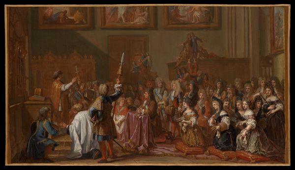 Curator: Let's take a look at this captivating painting, "Greek Wedding," attributed to Jean Baptiste Vanmour and believed to have been created sometime between 1720 and 1737. Vanmour, of course, was a pivotal figure in what we call Orientalism. Editor: Wow, it’s like stepping into a jewel box. The colors are so rich, and there's a definite air of theatricality about it, almost like watching a play unfold. Curator: Indeed. Vanmour’s genre paintings are crucial visual documents of Ottoman society in the early 18th century. Remember that he wasn’t just passively observing; he was actively interpreting, performing his own perspective within the framework of colonial power dynamics. Think about whose gaze is centered here. Editor: Makes me think, are we looking through a keyhole? There's this wonderful mix of staged formality and whispered gossip. You can almost hear the rustle of silk and the hushed tones. I’m also struck by the complete absence of men—it highlights female space. Curator: Precisely. Considering this, we must acknowledge that this portrayal could reproduce stereotypes or contribute to existing power imbalances of gender, which is important to recognize when we view it. It's also useful to explore these intercultural exchanges, asking questions about access and agency for Ottoman women within the harem and public life. Editor: That's such a valid point, the whole notion of the "harem fantasy" in European art and literature…I guess it reminds us how art can reflect cultural misunderstandings as much as insights. Still, the painter in me gets lost in those textures, those headdresses…they practically beg to be rendered in thick, impasto paint! Curator: Yes, the materiality cannot be ignored, this elaborate composition showcases Vanmour's refined technique with oil paints, highlighting details that could invite questions of how baroque elements interact with Orientalist themes of the 18th century. What this painting, therefore, might offer modern observers is insight on the early roots of what has today transformed into popular visual tropes of the orient, alongside its power laden implications. Editor: It’s given me a whole new lens to look at how stories are visualized and interpreted through art. So many assumptions to untangle. Curator: Absolutely, looking through multiple critical lenses, whether they are social, historical or purely aesthetic helps keep this image alive today, and relevant.