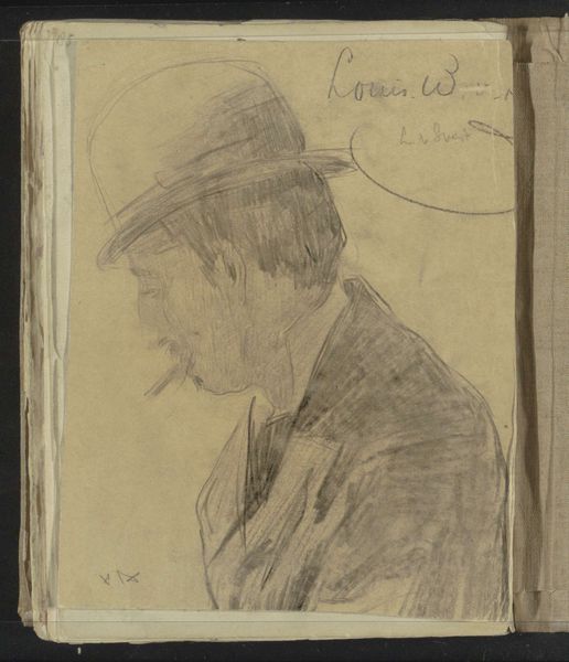Curator: Here we have a drawing by Floris Arntzenius, dating roughly from 1883 to 1914. It’s a portrait titled “Portret van kunstenaar Abraham Lopes Suasso,” created with graphite, charcoal, and pencil. Editor: It strikes me as melancholic, immediately. The subject’s pose, hand supporting his head, that deep shadowing – he’s lost in thought. A very internalized mood. Curator: Yes, and considering Suasso's position as a Jewish artist and collector in a time of growing anti-Semitism, this pensiveness could reflect his social and political environment, and the anxieties tied to belonging. He was a prominent figure but constantly straddling worlds. Editor: I notice the hat; it's almost an emblem of bourgeoisie respectability, yet seems heavy, another weight on his head. It also serves as a cultural marker. Headwear has historically signaled status and community. What is the iconography surrounding headwear of this kind during this period? Curator: Precisely! It encapsulates the conflicting pressures of assimilation and identity preservation. The artist's choice to render Suasso in such stark realism also makes a statement, contrasting with the often idealized depictions of the elite. It lends gravity and complicates easy interpretations of class and identity. Editor: And consider the artist’s choice of materials – humble charcoal and pencil rather than oil paints which are traditional of his social sphere.. There is a raw and unvarnished quality. The artist leaves visible sketch lines around the figure to highlight a lack of closure or finish to the subject matter’s situation. Curator: Indeed, it mirrors the subject's liminal status within society. It refuses to provide a complete image and forces us to consider the fragments, the gaps, the unseen struggles within that life. This portrayal subverts traditional notions of portraiture to represent internal realities of the artist as well. Editor: So true! Those lines, like whispered stories, carry his humanity and history. Curator: An evocative lens to view a time of enormous change and tension, brought to light through nuanced and intentional artmaking. Editor: Yes, layers of meanings are folded into this seemingly simple sketch. Thank you.