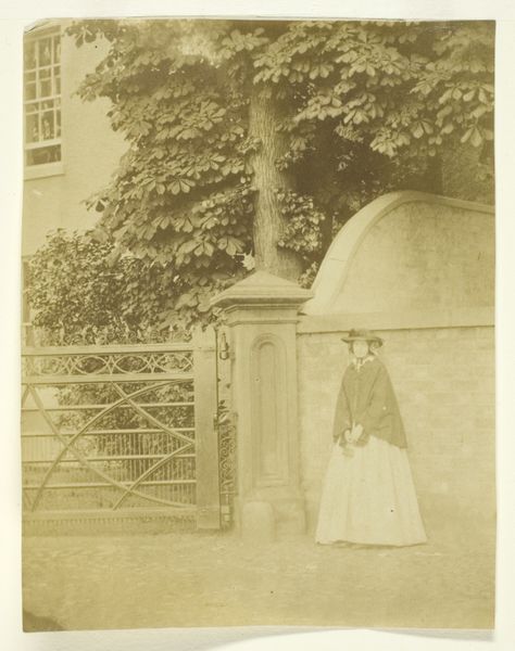 This albumen print shows an unidentified woman and two men standing outdoors and was likely made in the mid-19th century, around the time when photography emerged as a significant medium of artistic and social expression. The print offers a glimpse into the social dynamics of the era. The woman, dressed in a dark, full-length gown and hat, walks away from the viewer and the two men. The men wear formal suits and top hats, suggesting they are members of the middle or upper class. The setting, a well-maintained garden, further implies a level of social status and leisure. Consider the historical context: this image was produced at a time of rigid social norms and gender roles. The woman's posture and direction might reflect the limited agency afforded to women in public spaces, or conversely, her independent spirit within those constraints. The study of such images can be enriched by examining period literature, social histories, and the archives of photographic societies, offering a deeper understanding of its original context and meaning.