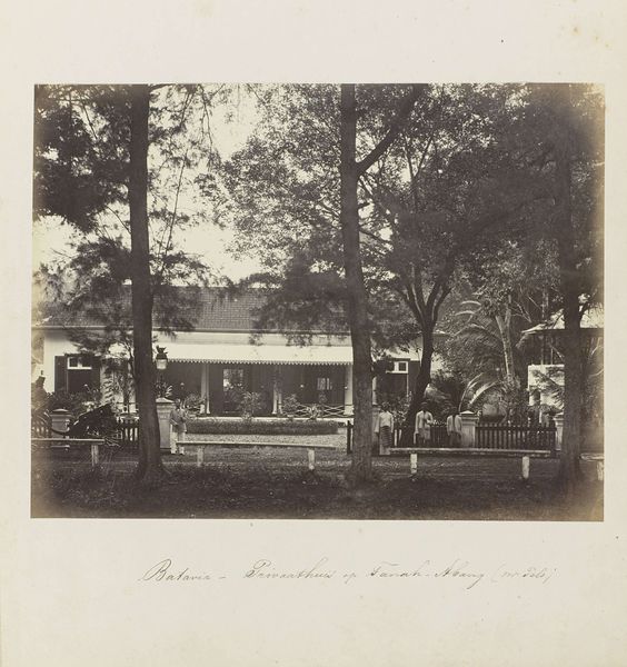 This photograph of a private residence on Koningsplein in Batavia, now Jakarta, was made by Woodbury & Page using the wet collodion process. The albumen print we see here relies on the skilled labor of preparing a glass plate with a light-sensitive emulsion, an aesthetic and material process inextricably linked to the era of colonial expansion. The sharpness and tonal range of the print depend on the careful manipulation of chemistry and light, resulting in an image of remarkable clarity. Yet, the photograph is not simply a neutral record. Its very existence speaks to the colonial context of Batavia, where the act of documenting architecture and urban life served to reinforce a particular worldview. The stark contrast between the Western-style house and the surrounding landscape, with the local figures sitting on the porch, hints at the social hierarchies at play. Considering the processes and context of this photograph allows us to see it not just as a picture, but as a material artifact embedded in a web of social and cultural meanings.