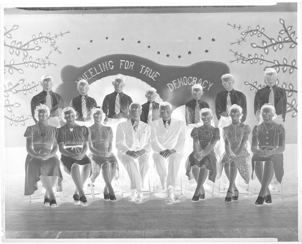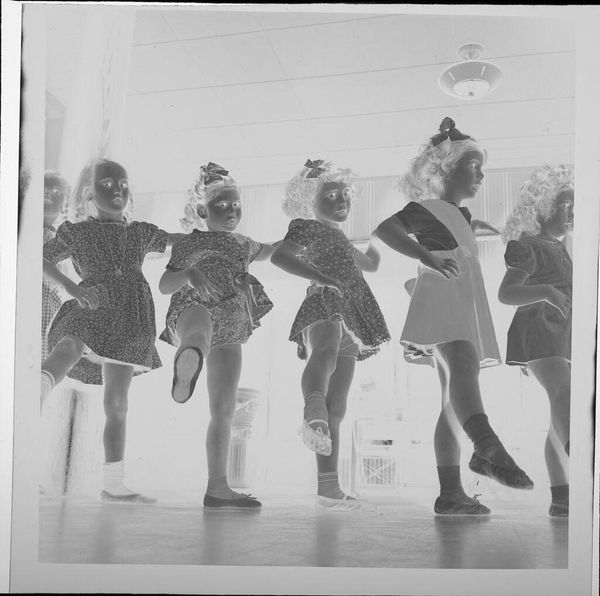 Curator: Jack Gould's Untitled photograph depicts a dance class, with children in mid-movement. It's a small gelatin silver print, just a few inches square, housed at the Harvard Art Museums. Editor: The high contrast gives it an ethereal quality. It's almost ghostly, these children suspended in time and space, reaching upward. Curator: Considering the socio-political context, dance, especially for young girls, has often been a space for prescribed gender roles and expectations. What do you make of that tension here? Editor: There is a beautiful sense of both freedom and constraint. The uniformity of dress and movement versus the individual expressions, the joy of the physicality of movement. It reminds me of how dance served as one of the few places women could convene. Curator: It is fascinating how Gould captures the cultural narrative around childhood. Editor: It’s a powerful distillation of the beauty and burdens we place on young girls.