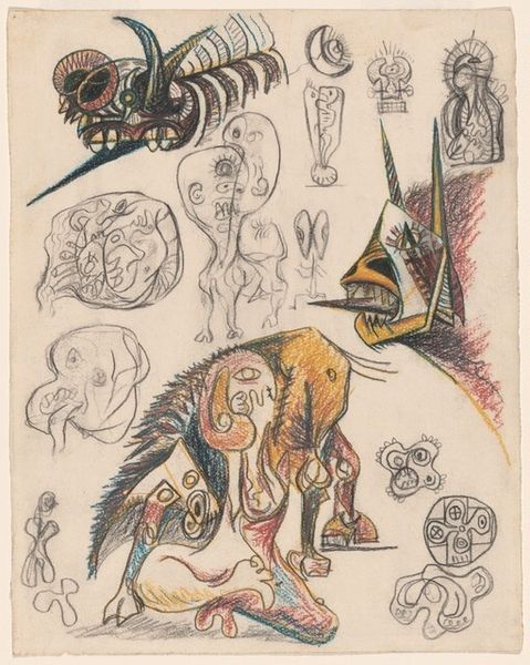 Editor: We’re looking at James Ensor’s “Rendez notre ancienne face fors les chers faux nez burlesques” from 1923, created with colored pencil. It's…well, it's rather grotesque. All these distorted faces surrounding a central figure. How do you interpret this work? Curator: Ensor's grotesqueries, these faces… they aren't simply about shock value. They emerge from a profound socio-political critique. How do you see these figures relating to the societal landscape of post-war Europe, particularly considering the rise of the bourgeoisie? Editor: I hadn't really considered that. I was just seeing weird faces. The "false noses," though... does that point to some kind of performance or masking of identity? Curator: Precisely! Ensor was deeply critical of the masks people wear, the ways societal norms and expectations distort authentic selves. Think about the societal pressures he experienced in Belgium – the political unrest, the clash between tradition and modernity. Do you see a sense of rebellion against those pressures here? Editor: Yes, I think so. It feels like a rejection of polite society, of forced conformity. The colors are almost childish, like a deliberate thumbing of the nose at good taste. Curator: Consider also the role of caricature throughout art history as a tool for social commentary. How does Ensor employ that tradition here, amplifying it to expose hypocrisy and question power? Editor: I guess it’s more than just being weird; it’s being purposefully provocative and deeply engaged with what was going on around him. It is much easier to think of the piece as satire or a caricature of society. Curator: Exactly. He compels us to question what is hidden behind appearances. Seeing art as activism opens new dialogues. Editor: This makes me want to revisit more Expressionist works thinking about the cultural climate.