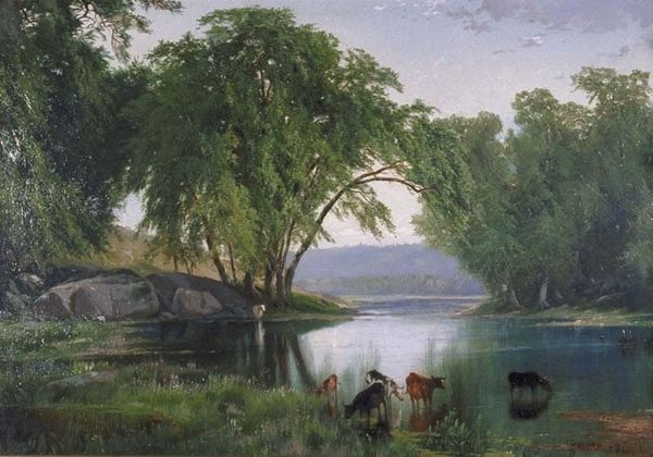 Curator: Lev Lagorio created this captivating "Landscape with Lake" in 1859, a prime example of plein-air oil painting. It depicts a serene lake scene, bathed in soft, diffused light. What strikes you initially? Editor: The overwhelming impression is one of tranquility. The artist's muted color palette evokes a peaceful, almost melancholic mood. I’m particularly drawn to the light filtering through the leaves. Curator: Absolutely, Lagorio was working within the romantic tradition, finding value in nature. The artist emphasizes nature through detailed renderings of foliage and water; how do you interpret it? Is it just landscape, or is there something more? Consider the fisherman. Editor: The solitary figure of the fisherman seems integral to the piece. However, the visual elements feel conventional—note the careful layering of colors in the water and sky to indicate depth. The light isn't groundbreaking, nor is it particularly expressive; the painter’s technical competence shines through. Curator: Interesting perspective. But is the conventional perspective, in itself, a message about the world or Russian society? Lagorio's works would later be connected with war, reflecting societal attitudes and consumption, the role of leisure... isn't the fisherman and quiet natural space almost in opposition to this world? Editor: I'd be careful associating *everything* with social upheaval. It's still, formally speaking, an accomplished painting, and you seem intent on situating every choice Lagorio made within broader social themes of production. I’m reluctant to abandon the artist’s control of form in pursuit of it being about social ideas and movements, though. Curator: Maybe that is the inherent divide in our perspectives then! I value how we contextualize the piece into larger concepts of humanity, whereas you value its structure. A meeting of styles that is embodied beautifully here in the art of this Romantic landscape. Editor: Precisely! Both of these distinct interpretations and perspectives on it. A wonderful piece to contemplate!