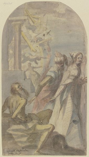Curator: Frank Cadogan Cowper's "St Agnes in Prison Receiving from Heaven the 'Shining White Garment'" depicts a moment of divine intervention. Editor: It's quite striking—the contrast between the earthy prison setting and the ethereal figure of the angel is so dramatic. Curator: The oil paint application is fascinating here; Cowper uses smooth, almost porcelain-like finishes for the angel and robe. Consider the labor involved in achieving that level of detail. Editor: Absolutely. The composition guides our eye from the dark corner to the illuminated garment. Notice how the verticality reinforces the divine descent, and Agnes’s upward gaze reinforces that. Curator: And the materiality of that garment! It's not just about the visual effect; it represents the divine grace being bestowed upon Agnes, a symbol of purity made manifest. Editor: For me, it's the psychological tension. The isolation of the saint, the hope in her expression—they create a deeply moving experience. Curator: Exactly. Cowper uses material to amplify that emotion. Editor: After examining its structure and symbolism, I find it to be quite powerful and enduring. Curator: Yes, a testament to how the act of creating itself can convey the narrative.