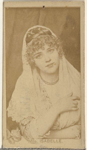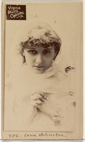 Curator: Let’s turn our attention now to this fascinating portrait of Julia Marlow. It’s a print from 1890, part of a series called "Actresses," distributed by Kinney Brothers to advertise their Sweet Caporal Cigarettes. Editor: There's something melancholic about this image, isn't there? The soft sepia tones, the way she’s gazing downwards… it feels very intimate and subdued, considering it was an advertisement. Curator: Indeed. The late 19th century witnessed an explosion of such commercial images, and actresses like Marlow, were often depicted in these collectible cards. This print reveals the emerging celebrity culture and the pervasive use of women's images in advertising. Editor: It's fascinating how it uses Marlow's celebrity to sell cigarettes. Was she aware, or did she endorse this connection to tobacco use? And what message was that sending to women at the time? It seems almost predatory to promote to that demographic using women icons. Curator: Well, records aren’t entirely clear. Endorsement wasn’t always a transparent process then. The imagery, with its delicate almost impressionistic style, connects to a wider visual language which helped both to popularize the product and to shape perceptions of feminine beauty and refinement at the time. These promotional images definitely influenced broader cultural attitudes, solidifying or perpetuating gender roles. Editor: Absolutely. I find the romantic style juxtaposed with its use as a promotional tool especially striking; these portraits sold an image of elegance to cigarette smokers, constructing specific narratives about beauty, pleasure, and aspiration. This highlights a larger problematic power dynamic. Who is given visibility, and at what cost? Whose image gets circulated and for what purpose? These questions continue to be incredibly relevant today. Curator: Very true. Studying it offers insight into the intersection of commercialism, art, and the construction of identity. Editor: For me, this image encapsulates the complex power dynamics inherent in the commercialization of art and celebrity, raising pertinent questions about agency, representation, and the ethical implications of promotional media even in our contemporary setting.