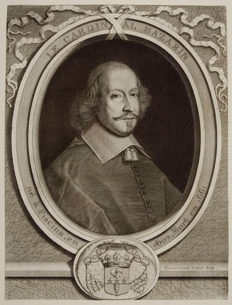 Pieter van Schuppen made this print of Jules Mazarin. This portrait presents Mazarin, the Italian cardinal and diplomat who served as chief minister to the French kings Louis XIII and Louis XIV, in a manner befitting his high status. The elaborate frame, replete with symbolic imagery and Latin inscriptions, elevates the subject beyond a mere likeness. Made in the 17th century, this work reflects the French court's self-conscious construction of power through visual representation. The strategic use of iconography associates Mazarin with virtues of nobility, intelligence, and piety, reinforcing his authority. The print would have circulated among the elite, solidifying Mazarin's image and legitimizing his political influence. To fully understand this image, we can look to period documents: letters, memoirs, and political pamphlets. These resources reveal the complex social dynamics of the French court and the ways in which images like this played a crucial role in shaping public opinion and maintaining social order.