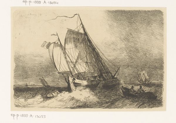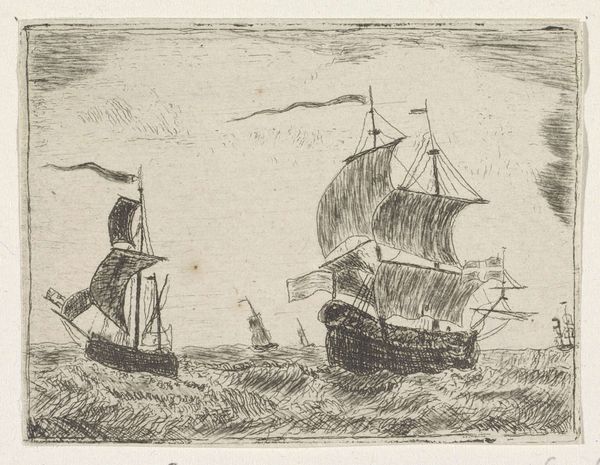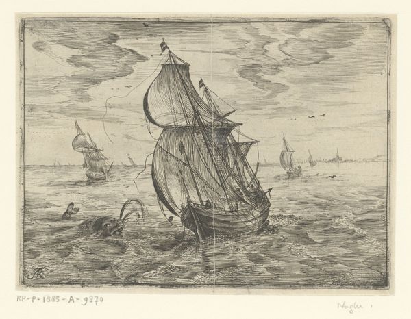 Editor: So, this is "Christ Walking on the Water," an etching from the late 17th century by Monogrammist AB. The turbulent sea really dominates the image. There are so many ships in the background. What symbols jump out at you? Curator: The visual vocabulary here certainly resonates. Water, for instance, traditionally symbolizes chaos, the unconscious, and potential danger. Notice how Christ, usually at the center of such narratives, is quite small here, almost obscured by the imposing nature around him. It makes one wonder if it's really about doubting rather than believing. Do you get a sense of unease from the scene? Editor: Absolutely, there's definitely a feeling of vulnerability, even fear, despite the religious context. Are those other boats in the background relevant, too? Curator: They become significant symbols of humanity’s reliance on faith amid life's unpredictable storms. And consider that the Golden Age Dutch artists loved seascapes, it speaks to their maritime power and reliance on the sea. Can you see a connection to their society through this biblical story? Editor: It’s interesting how it layers religious narrative onto a celebration of the Dutch sea power. It’s like they're subtly equating their own struggles with this famous story of faith. I hadn't really considered it that way. Curator: The etching makes the message universal. The image reminds us that while faith offers solace, confronting the tempest of life is never without doubt and vulnerability. Editor: I appreciate how the cultural context informs the way we interpret the artwork. It really isn't just a story from the Bible. Thanks!