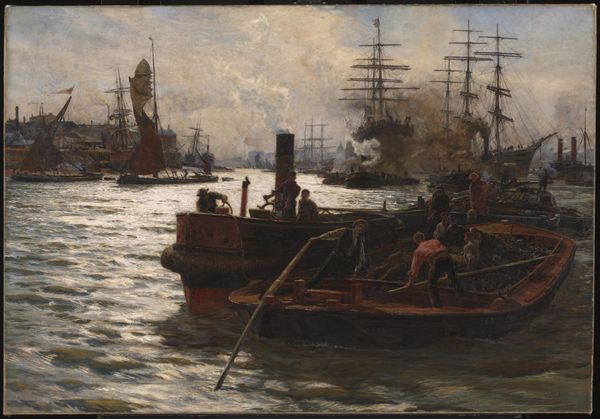 Curator: Ioannis Altamouras's "Seascape," showcases a harbor scene rendered in oil paint, although the specific year of its creation remains unconfirmed. It offers a fascinating glimpse into maritime life. Editor: Immediately, I notice the way the artist utilizes light – or perhaps subdues it. There’s a distinct moodiness, an almost industrial quality with the smoke billowing out, despite being a seascape. I am curious as to the precise application of brush strokes used. Curator: It's interesting you say "industrial." While aesthetically aligned with the Impressionists in some ways, consider the broader political and economic context of Altamouras's era. Seascapes like this often reflected burgeoning trade and naval power of nations at the time. How might the painting have played into that visual rhetoric? Editor: Absolutely, it could be argued that these ships symbolize the burgeoning movement, but I see how the materiality of the paint itself contributes to that atmosphere. The thickness, the impasto in the sky, those short, choppy strokes used to render the water – it all speaks to labor, doesn’t it? Curator: Indeed. These depictions served as visual tools in shaping public perception and national pride. By romanticizing seafaring and commercial activity, seascapes could effectively mask the darker realities of labor practices and colonial expansion. The painting, then, enters into the larger discourse of empire. Editor: Yes, but does it? The painting also subtly shows the tools, technologies, and sheer labor that enables the creation of an illusion for the consumer, and shows the making-of of art production with layers of built-up texture. Curator: Fair enough. By carefully looking at the artistic elements within a broader view of history, the painting allows for a multi-layered discussion that considers artistic intention and wider, potentially conflicting socio-political functions of imagery. Editor: The piece reveals aspects of the industry through artistic expression. Curator: In effect, it reveals how art is so entrenched in a particular social climate, helping viewers consider artistic choices. Editor: Examining how this visual representation reflects and interacts with those aspects reveals the interconnectedness of material reality.