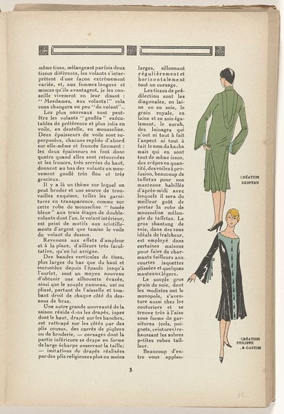 Curator: This printed page comes from a 1931 issue of "Art - Goût - Beauté", a French fashion magazine focused on women's elegance. The page, titled "Les Tailleurs et Leurs Blouses", or "Suits and Their Blouses," presents illustrations of different outfits, created using a mixed-media approach of print and probably some hand-coloring. Editor: Immediately, I am struck by how these figures feel like symbols. They stand as almost hieroglyphic representations of ideals rather than portraits of individuals. Curator: I notice the details about construction; the page's text details how the suits are three pieces. There are elements about material as well – noting “supple fabrics”. It suggests not just designs but specifies techniques like pleating, embroidery, and the application of delicate colors to add richness. Editor: Yes, look at the hats, for example. These could represent status or occasion. The yellow dress could have ties to something entirely cultural that’s lost to me now – they carry information! Each one feels like an attempt to encapsulate an aspect of 1930s femininity into symbolic form. Curator: Exactly. The materials indicate what was becoming industrially feasible and available. What kind of dyes were common, for instance? How did print-making technology allow this aesthetic to proliferate into a popular fashion? We might also consider the labor conditions and distribution networks that got it to a broad consumer base. Editor: Absolutely, the symbolism exists on many levels, and there’s so much emphasis on how a blouse is built with embroidery and with cut. Consider the very fact that these designs were considered fashionable highlights how taste is manufactured and spread within the culture. Curator: Examining all that reveals this beautiful confluence of artistic representation, design, and the machinery of production and consumption. Editor: Indeed. Peeling back these symbolic layers illuminates broader currents, revealing enduring archetypes of how fashion and its imagery influence a society.
