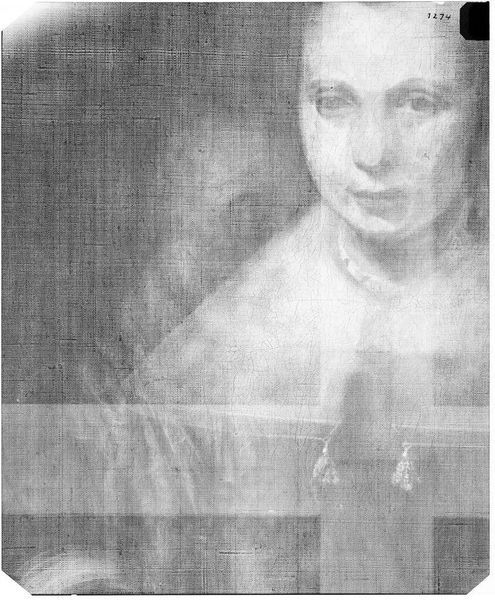 Curator: Here we have an X-radiograph of "Margaret de Vos," a portrait by Gaspar de Crayer. What strikes you about it? Editor: It's like seeing a ghost. The skeletal structure beneath the surface, literally, is fascinating and eerie. Curator: The X-ray reveals the artist's process, the underpainting, the hidden layers of intent. It reminds us of the invisible forces shaping identity, much like how symbols shape our understanding. Editor: Absolutely. It's the bones of the painting, you know? The bare minimum required for it to exist. I wonder about the real Margaret de Vos though, and what she would make of this? Curator: Indeed, it brings a new layer of understanding of what a portrait is all about. Editor: Yes, a ghost within a ghost.