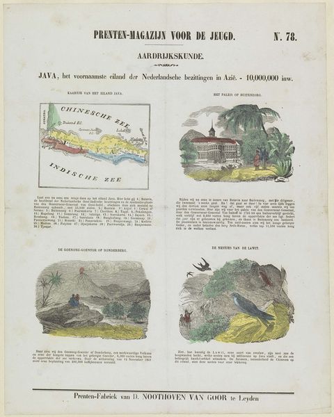 Curator: This print, entitled “Dieren,” dating from 1850 to 1881, comes from the hand of Dirk Noothoven van Goor and employs lithography. What are your immediate thoughts? Editor: It’s fascinating! The composition feels so distinctly of its time, doesn't it? Almost like a page from an illustrated encyclopedia, showing little glimpses of narrative moments with each animal. A pre-cinematic storyboard about nature! Curator: Precisely! Consider how such imagery might have shaped perceptions of the natural world at that time. Before accessible photography, prints like these served as primary sources of information. How do you read the depictions? Editor: Well, there’s an interesting duality. On one hand, there is an attempt at a scientific portrayal. On the other, these aren't merely specimens; they are situated in anthropomorphic tableaus. Notice the fox seemingly 'speaking' to the squirrel! It's not simply biology, but social commentary using animals as allegorical figures. Curator: A potent point. The narrative aspect connects it to folklore traditions, and certainly informed a broader understanding about Dutch national identity as shaped by the natural world around them, but even class. How the images relate to social strata merits consideration, as it suggests the public role of art to serve social hierarchies of man's mastery over nature. Editor: It is about accessibility. This was, after all, conceived as educational material, literally a ‘print magazine for youth’. Curator: Ultimately, it invites consideration of the complex layers embedded within seemingly simple imagery. Editor: I agree. And it certainly makes me contemplate our relationship to representing nature through printed media today.
