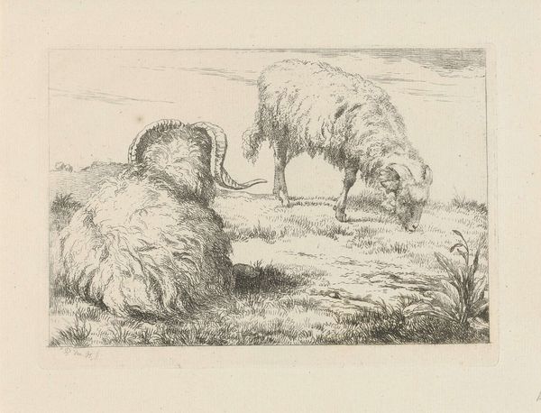 Johannes Mock created this print of four resting sheep using etching. Mock lived through the Napoleonic era and the subsequent Kingdom of the Netherlands. The pastoral subject matter of sheep is a scene of rural tranquility, however we must consider the place of agriculture in the Netherlands. The Netherlands has a long history of land reclamation and efficient farming which is deeply embedded in the nation's identity. The sheep in this image are anonymous and grouped together. This image is a quiet reminder of humanity's use of the natural world, domesticating it for production. Though seemingly simple, this image reflects the complex relationship between people, land, and resources. There is a harmony to be found in these sheep resting together, as they emphasize our connection to the natural world.