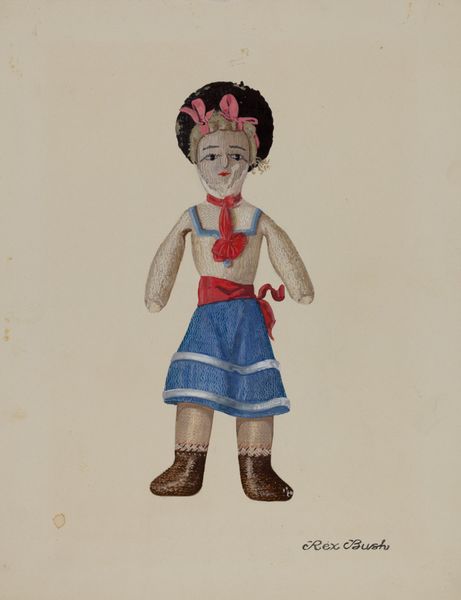 Beverly Chichester made this watercolor painting of a doll. At first glance, it may look like a straightforward depiction, but there's more to it than meets the eye. Watercolor offers a unique transparency, allowing the white of the paper to shine through, creating a sense of luminosity. The wispy, washy application of the paint gives a softness to the image, almost like a memory or a dream. This is particularly apparent in the rendering of the doll's dress, where the fabric seems to float and flow. But there's also a fascinating contrast at play. The doll itself, with its meticulously rendered costume and accessories, speaks to the tradition of craft. It's a reminder of the labor and skill involved in creating such objects, as well as the cultural values they embody. Dolls have often served as symbols of childhood, domesticity, and even social status. By presenting this doll through the lens of watercolor painting, Chichester invites us to reconsider the relationship between high art and craft, urging us to see the inherent value and meaning in both.
