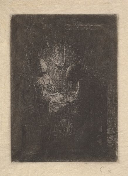 Curator: Well, hello there! Staring back at us is Félicien Rops' "First Step," etched onto paper in 1883. A mysterious lady steps from the gloom into… what exactly? Editor: Gloom indeed! It’s mostly shadows, isn’t it? Dark and suggestive. Makes you wonder what’s she stepping *into*, but also what’s she running *from*. Like a half-formed memory. Curator: Rops was all about the provocations and decadent fantasies, playing with social anxieties, especially around women and sexuality. Consider the history painting aspects intertwined with symbolist tendencies! He always walked a very naughty line. Editor: That corset screams "society" doesn't it? All structured and imprisoning. And yet, the frills hint at… well, flirtation with freedom perhaps? It's this interplay of restraint and liberation that's so compelling. The textures achieved with that etching technique are superb, by the way. Curator: Absolutely, etching gives that lovely granular feel, heightening the shadowy drama, don't you think? Beyond the masterful technique, this work underscores how art can dissect societal facades. Remember how public institutions shaped Victorian perceptions. Editor: It’s all perception isn’t it? I imagine different viewers bringing vastly different experiences to this. For some, a vision of liberation. Others, a descent. All the better for it! I'm tickled by how modern the dark aesthetic feels. Curator: He definitely wanted to provoke a reaction, get under your skin. A successful stepping out of line. A glimpse into something transgressive, you could say. Rops did it his way! Editor: The real charm for me resides in how little is defined and how much the unknown adds layers of intrigue. It’s wonderfully enigmatic, the "First Step." I might ponder what happens next. Curator: That sense of unease is powerful. It makes one question societal boundaries. Now, that is effective artistry.