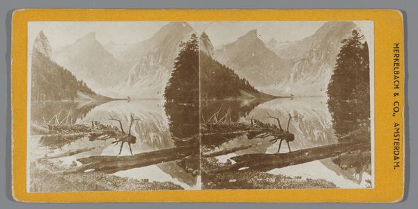 Editor: Here we have Arthur Gabler's "Man on the Shore of Daubensee," made sometime between 1876 and 1888, an albumen print touched with colored pencil. I find the image contemplative, almost melancholic. What catches your eye? Curator: The lone figure immediately draws my attention. Sitting perched on that precipice, observing the serene lake and towering mountains… it’s potent symbolism. Think about the romantic idea of the “wanderer above the sea of fog." Do you see how that archetype might be at play here? Editor: I do, actually. There’s definitely a feeling of humanity dwarfed by nature's grandeur. Curator: Exactly! And consider the cultural memory embedded in these landscapes. Mountains often represent challenges, spirituality, or the sublime in various cultures. Water, too, is a deep well of symbolism, evoking cleansing, the subconscious, the cyclical nature of life. How might this composition reflect those long held notions? Editor: The way the mountains seem to guard the water adds a sense of the sacred. And with the man in the foreground, there's a connection being forged between the tangible and the spiritual. Curator: Precisely. It encourages a reflection on our relationship to nature, history and, perhaps most significantly, ourselves. A solitary figure contemplating the world…it's a powerful visual motif, ripe with meaning. Editor: It’s fascinating how seemingly simple images can be so rich in symbolic and historical depth. Thanks for illuminating all of that. Curator: My pleasure! The beauty of art lies in its enduring ability to hold up a mirror to ourselves and to our cultural heritage. It encourages a thoughtful reflection on timeless human themes.