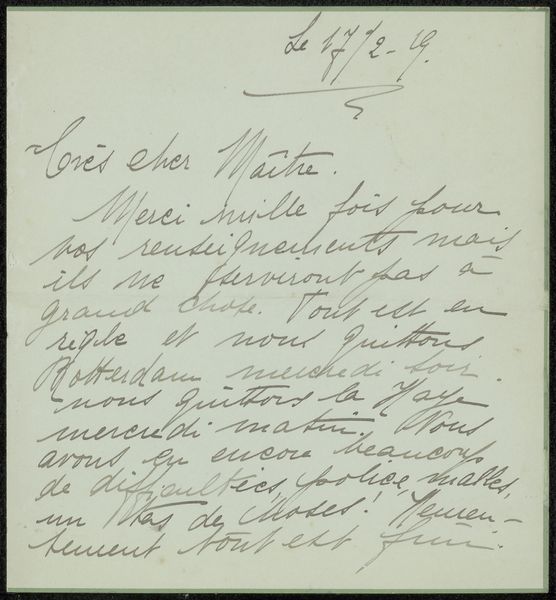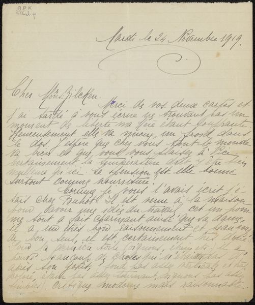 Curator: I’m struck by the elegant simplicity of this piece titled "Brief aan Henriette Wilhelmina van Baak en Philip Zilcken," possibly dating between 1921 and 1929. It's a drawing on paper using ink, so its physical presence is rather humble. Editor: Initially, I’m captivated by the delicate script—the almost uniform line weight speaks to me, the evenness of the application revealing considered intent and masterful execution. It radiates a gentle refinement, and melancholy of past correspondence. Curator: That script is revealing, isn't it? Consider the gesture of a handwritten letter—especially this one, likely a note of thanks for some flowers— it is quite symbolic. The act carries an intimacy now largely displaced by digital forms of communication. The dried flowers even seem to become almost saint-like relics from their donor. Editor: Indeed, and I am particularly drawn to the formal relationships between the letterforms themselves. Note the way certain letters loop and intertwine, the ascenders and descenders creating visual rhythm and unity on the aged paper. The use of a simple palette enhances its classical purity. It seems so perfectly balanced. Curator: Beyond aesthetics, there is something very telling embedded within the text of handwritten thank you notes like this one; consider how flowers represent so many things—sympathy, admiration, beauty, love—the list is extensive. In a world undergoing immense upheaval between world wars, they stand as an interesting visual of that turbulent time and also a desire for simple beauty, which often carries social implications. Editor: And, from a structural perspective, even the stain of time, seen in the aged and worn quality of the paper, plays a crucial role in conveying meaning. These tonal variations enrich our viewing experience, accentuating visual subtleties—such as a certain density of lines and a lightness overall, working together to build harmony. Curator: Examining an everyday token with this level of care unveils the lasting impact even the most common forms of communication have. It reflects how traditions and even individual objects like the dried blooms referenced can weave powerful tapestries across generations. Editor: Absolutely, it also affirms that an intricate examination of visual structure and arrangement can, indeed, elevate what appears to be straightforward—encouraging new interpretive readings to light our path and ultimately enriching perception itself.