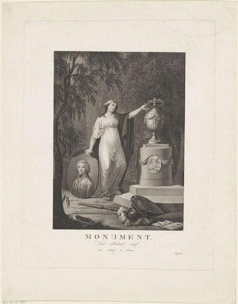 J.F. Clemens created this print titled "Den mosaiske Religion". Its grayscale palette and precise lines render a scene that merges classical and religious motifs. The artwork presents a figure, blindfolded, reclining against tablets inscribed with text. Her posture and the items scattered around her, such as a broken staff and extinguished lamp, create a composition rich in symbolic elements. The blindfold, a central structural device, destabilizes traditional notions of insight and knowledge. The objects, arranged with intention, function as signifiers within a semiotic structure, inviting viewers to interpret their relationship to Mosaic law and religious doctrine. Clemens seems to challenge fixed interpretations of religious virtue, prompting a reconsideration of the relationship between belief, authority, and interpretation. The work reflects broader philosophical concerns about knowledge, sight, and insight during the artist's time.