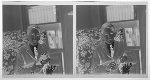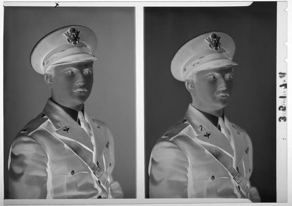 Curator: This is an untitled double studio portrait by Martin Schweig, part of the Harvard Art Museums collection. It depicts a man in a U.S. Navy uniform. Editor: Immediately, I notice the high contrast—almost ghostly. It feels like a memory, a moment captured and then…faded, maybe? Curator: Indeed, the negative print enhances the sense of a past moment. It invites us to consider the cultural significance of naval uniforms and the construction of identity within the military. Editor: I love how the duplication almost gives it a sense of unease, or double vision. Like, is this one man’s experience, or the experience of many, echoing across time? Curator: The repetition underscores the systemic nature of military service and its impact on individuals. It prompts questions about conformity, discipline, and the narratives we tell about war and peace. Editor: It really makes you think, doesn't it? Both about the individual and the larger forces at play.