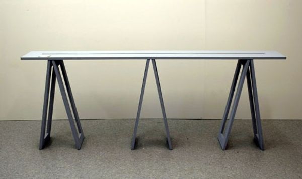 Editor: So, here we have Anthony Caro’s “South Passage,” created in 2005. It’s an installation made from metal. I’m really struck by the contrast between the cool, industrial gray and those vibrant red cylindrical elements. It feels like a skeleton with arteries pumping through it. How do you interpret this work? Curator: Well, viewing “South Passage” through a historical lens, I think Caro's manipulation of industrial materials after the decline of manufacturing is fascinating. He takes the skeletal remains of industry and transforms them into something aesthetically engaging. These works entered a post-industrial landscape, which certainly gave them significance as historical markers of cultural shift. Don’t you think the use of these prefabricated elements gives the piece an almost ready-made quality, challenging traditional notions of artistic creation and authorship? Editor: I see what you mean. It's almost like he’s commenting on the shift in labor, right? Instead of shaping something entirely new, he’s assembling existing parts, sort of like a comment on the role of art after industrialism. Curator: Precisely. Caro often sought to redefine the relationship between sculpture and space. This work invites viewers to engage with the space it occupies and its aesthetic construction. Notice how the geometric lines interact and disrupt the visual space around them. I'm interested: what does this interplay suggest to you? Editor: The openness is striking; the transparency of its design makes you aware of the volume, challenging assumptions about art's social place and function in shared spaces. The placement of the vibrant, red elements directs the viewers gaze to move across the piece as if through an active mechanism. Curator: The color then highlights not only direction and energy but a human touch in opposition to the hard angles of industry. What do you think about the ways museums curate similar artworks? Editor: That's a good question! The open nature could lead to an invitation for community members to offer artistic responses which democratizes museums in new and insightful ways. Curator: Absolutely! Thinking about "South Passage" has highlighted the evolution of sculptural forms within historical settings. Editor: It’s been a real eye-opener, seeing it as a social commentary rather than just an abstract form.