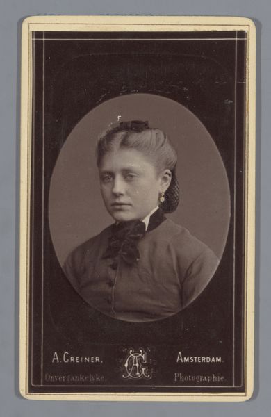 Curator: A melancholic air pervades this portrait. The gelatin-silver print, titled "Portret van een onbekende vrouw" and created sometime between 1891 and 1917, is a poignant capture of a woman shrouded in anonymity. Editor: The oval framing isolates her. I notice the tonal range, how it emphasizes her direct, almost challenging gaze, drawing us in. The texture of the ruffled dress contrasts sharply with the smoothness of her face. Curator: That dress, that crisp white collar…It situates her in a precise socio-economic bracket, doesn't it? Yet her name is absent, lost to the patriarchal archive, reflective of women’s frequent erasure in historical narratives. We are left to speculate about her desires, ambitions… Editor: The semiotics of studio photography in this period dictate a certain stillness, an idealised representation. Yet, there’s a dynamic asymmetry. Her hair is swept back, revealing one ear and directing us to one side, an unfinished or unseen narrative element. Curator: Exactly! Her steady gaze confronts us with this inherent contradiction – a manufactured image that hints at hidden complexities, making it fertile ground for exploring female agency within societal constraints. Her gaze demands acknowledgement. Editor: Looking at this I see that in capturing a human subject so expertly within the technical bounds, this highlights a masterful formal structure that remains visually impactful despite the absence of contextual details. It is quite compelling. Curator: True. While the formal choices create aesthetic appeal, that inherent "lack" urges me to delve deeper into the woman's context— to reclaim her identity and disrupt assumptions. Editor: A fine interplay between visual dynamics and historical undercurrents, indeed. Curator: Ultimately, her anonymity prompts important reflections on whose stories are prioritized in our collective memory.
