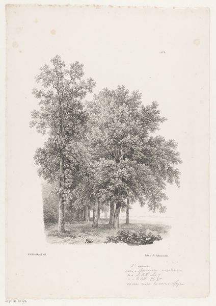 Curator: This pencil drawing, rendered by Pierre Louis Dubourcq circa 1840, is titled "Vrijstaande loofboom in landschap," or "Solitary Deciduous Tree in a Landscape". Editor: My immediate impression is one of immense stillness. Despite the density of the foliage and undergrowth, a profound calm permeates the scene, amplified by the monochromatic rendering. Curator: The romanticism of the era shines through, doesn't it? Note how Dubourcq elevates the tree to a symbol. It’s more than just a tree; it stands as a silent witness, evoking contemplation on time, nature, and our place within the larger world. Its placement almost center, certainly elevated and with all of the other components leading toward it reinforces the importance of the tree itself. Editor: Yes, I agree. Formally, it’s quite striking. The artist’s mastery of line and shading really creates a sense of depth, especially with the juxtaposition of that meticulously detailed foreground against the hazier background elements. I particularly notice the stippling technique in the crown of the tree, which lightens that area in a lovely way. Curator: Consider the tree as a cultural touchstone. In many traditions, a tree represents life, growth, and interconnectedness, it’s as much a formal exploration as it is a commentary on nature's enduring power. This symbolic tree invites introspection, and perhaps even a sense of personal connection to nature's persistent rhythms. Editor: An apt summation. Viewing "Vrijstaande loofboom in landschap" provides an exercise in patient observation. Each pass brings the viewer ever deeper into its intricacies and ultimately, to that powerful sense of quietude. Curator: And perhaps that's the true gift of the Romantics. They hold up the stillness for us, in a way that allows us to better see and contemplate ourselves within its space.