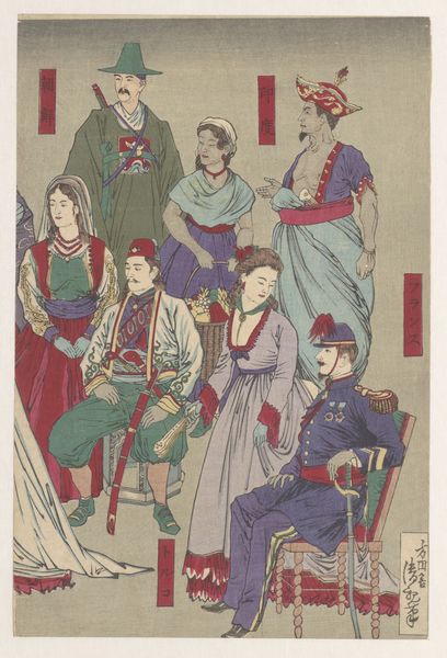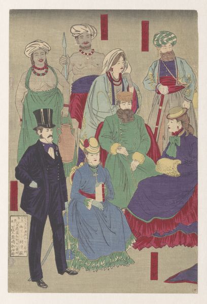 This print, titled "Buitenlanders vermaken zich tijdens een banket", was made by Utagawa Yoshikazu in the mid-19th century. The artist used woodblock printing, a traditional technique in Japan. You can see the careful registration of colors, and the flat planes of ink, which give the image its distinctive character. The print depicts a banquet scene with foreigners, likely Europeans or Americans, in what appears to be a Japanese home. Woodblock printing involves carving a design into a block of wood, inking the surface, and then pressing it onto paper. Each color requires a separate block, so the print represents a significant investment of labor. This was often divided, with specialists for carving, printing, and design. The image provides insights into cross-cultural interactions and the artist’s interpretation of Western customs, suggesting a moment of cultural exchange, but also the labor and means of production that would allow for this type of event to take place. Paying close attention to the materials and processes used in its creation, and its original social context, allows us to fully appreciate the richness and complexity of this artwork, and to challenge distinctions between the fine and decorative arts.