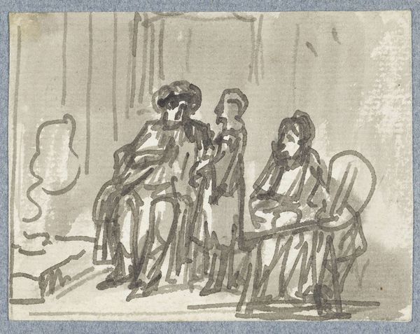 Editor: This pen and ink sketch, "Et par i en sofa, pigen sovende"— "A Couple on a Sofa, the Girl Asleep"—is attributed to Wilhelm Marstrand, created sometime between 1810 and 1873. It’s got such a casual, intimate feeling, almost like a stolen glance at a private moment. I'm curious, what do you see in this piece? Curator: Ah, Wilhelm! I always think his drawings contain an intimacy. Perhaps its because it allows us to become fellow observers alongside Marstrand. Notice the gaze of the seated man – playful, isn't it? Almost a silent dare with the viewer: "Look, but don't disturb!" What's she dreaming of, I wonder? Perhaps, more importantly, what's he *imagining* she’s dreaming of? Editor: That's a lovely thought, the man's imagined dream. I was also struck by the bareness of the room; the window and blank picture frame feel symbolic in some way. Curator: Symbolism thrives in absence as well as presence. And Romanticism was particularly skilled at understanding absence. Consider this 'bareness' as potential energy... all that 'could be' occupying their minds – anxieties or fantasies! That empty frame could be a window into their aspirations, no? Editor: I suppose so! It reframes my whole perception of the artwork. Curator: Wonderful. Now, the real question is, what possibilities does it open for you? Editor: Well, I guess it encourages a deeper exploration, seeing beyond the surface of simple genre-painting into an introspective journey of potential. I learned a lot. Thanks. Curator: And my thanks to you! A drawing gains true colour when seen through another’s eyes.
