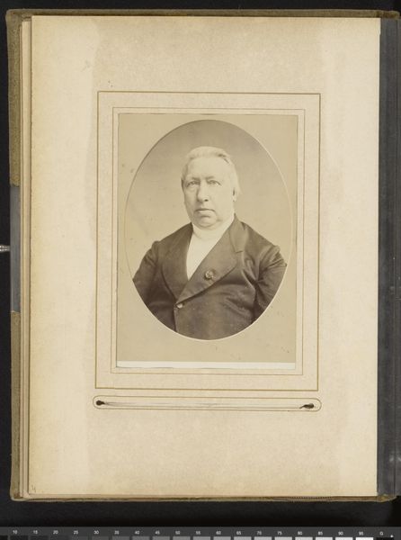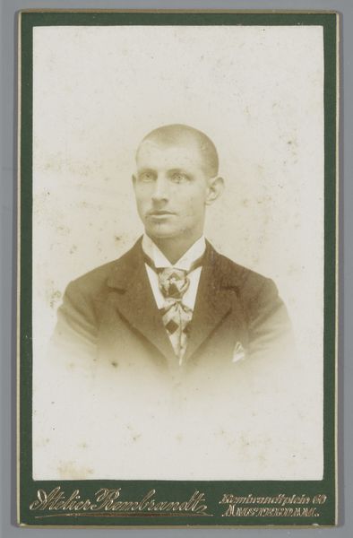 Editor: Here we have a photograph from the Rijksmuseum collection, dating roughly between 1874 and 1887. It’s a gelatin silver print, a portrait by Albert Greiner titled "Portret van een onbekende man, aangeduid als de heer Jobben" or "Portrait of an Unknown Man, Referred to as Mr. Jobben." I find the formality of the sitter striking. What can you tell us about it? Curator: It's important to recognize that the rise of photography democratized portraiture. Suddenly, not just the wealthy could afford to have their likeness preserved. However, the performative aspect remains fascinating. How much is "Mr. Jobben" curating his own image here? His suit, tie, and serious demeanor project a certain status, a striving for middle-class respectability perhaps? Editor: That’s interesting. So you’re saying it's not just a straightforward representation but a constructed identity? Curator: Precisely! Photography, like painting before it, became a tool for social mobility. Think about the studios popping up – Greiner in Amsterdam, in this case. They were businesses catering to a desire, a hunger, for visual representation within a specific social framework. What does this tell us about late 19th-century Dutch society? Editor: That makes me consider the context of photography at the time and the sitter's choices to align with that context to signal something about himself. This wasn’t just about capturing an image. Curator: Exactly. It highlights the constructed nature of photographic truth and the powerful role imagery plays in shaping social perceptions and individual identities. The photographic studio becomes a stage for social performance. Editor: I'll definitely think about portraiture in terms of performance now, and what that performance says about its time. Thank you. Curator: My pleasure! It's these little-known portraits that often provide the richest insights into the past.