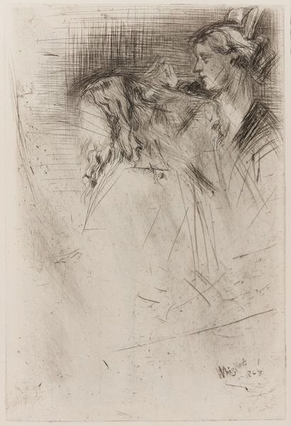 Editor: This is Georges Seurat’s "Woman Seated by an Easel," a drawing from the late 19th century. The grainy texture makes me wonder about the materials he used. What can you tell me about it? Curator: Notice how Seurat built up the image through layers of conte crayon. The labor-intensive process itself becomes a significant aspect of the work, challenging the traditional hierarchy between drawing as preparatory and painting as the finished product. What does this repetitive application suggest about Seurat’s artistic practice? Editor: It sounds like a very conscious effort to redefine artistic labor, making it more about the process than just the outcome. Curator: Exactly. By focusing on the materiality and the means of production, Seurat elevates the status of the drawing and questions established notions of artistic creation and value. Editor: I hadn't considered the work in those terms. Thanks, that’s a whole new perspective!